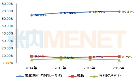 2017年的數(shù)據(jù)看,東北制藥以69.31%的市場份額位居首位,原研廠家輝瑞以8.79%的比例緊接其后。從近幾年各大品牌的市場份額變化看,東北制藥基本呈現(xiàn)穩(wěn)定增長的態(tài)勢,輝瑞的市場份額則有所波動。