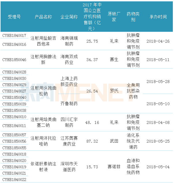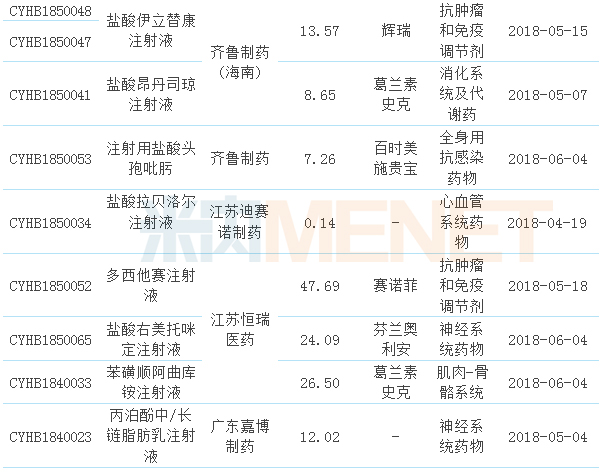 從治療類別看,14個品種中有5個為抗腫瘤和免疫調節(jié)劑,可見抗腫瘤領域是藥企們申報的重點,消化系統(tǒng)及代謝、神經系統(tǒng)藥物、全身抗感染藥物均有2個產品;從產品的申報廠家看,齊魯制藥及子公司申報的產品最多;從申報的產品看,除了注射用頭孢曲松鈉有2家企業(yè)同時申報外,其他品種均只有1家企業(yè)申報;從產品的銷售額看,2017年在公立醫(yī)療機構終端銷售額超過10億元的產品有11個(超過20億元的有8個),其中注射用泮托拉唑鈉接近90億元,注射用培美曲塞二鈉及多西他賽注射液接近50億元。