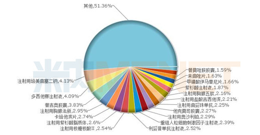 截至目前,申報一致性評價的抗腫瘤產品在2017年中國公立醫(yī)療機構終端抗腫瘤和免疫調節(jié)劑的競爭格局中均處于主導地位,注射用培美曲塞二鈉以4.13%的比例位居首位,多西他賽注射液以4.09%的比例緊接其后,注射用胸腺法新以2.95%的比例排位第四。