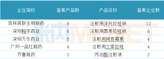 2:注射劑一致性評價參比制劑備案企業(yè)及產品TOP5