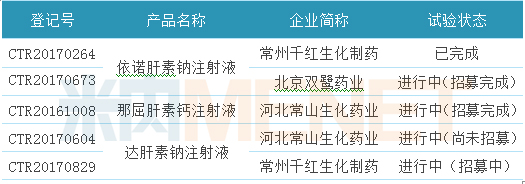 截至目前,一致性評價中準備開展/已開展/已完成BE試驗的注射劑有5個登記號,涉及企業(yè)3家,品種3個。從進行試驗的企業(yè)看,常州千紅生化藥業(yè)、河北常山生化藥業(yè)均有2個產品處于試驗階段;從試驗的產品看,有2家藥企進行BE試驗的依諾肝素鈉注射液,深圳市天道醫(yī)藥已搶先一步,其產品已經處于申報一致性評價的隊列。