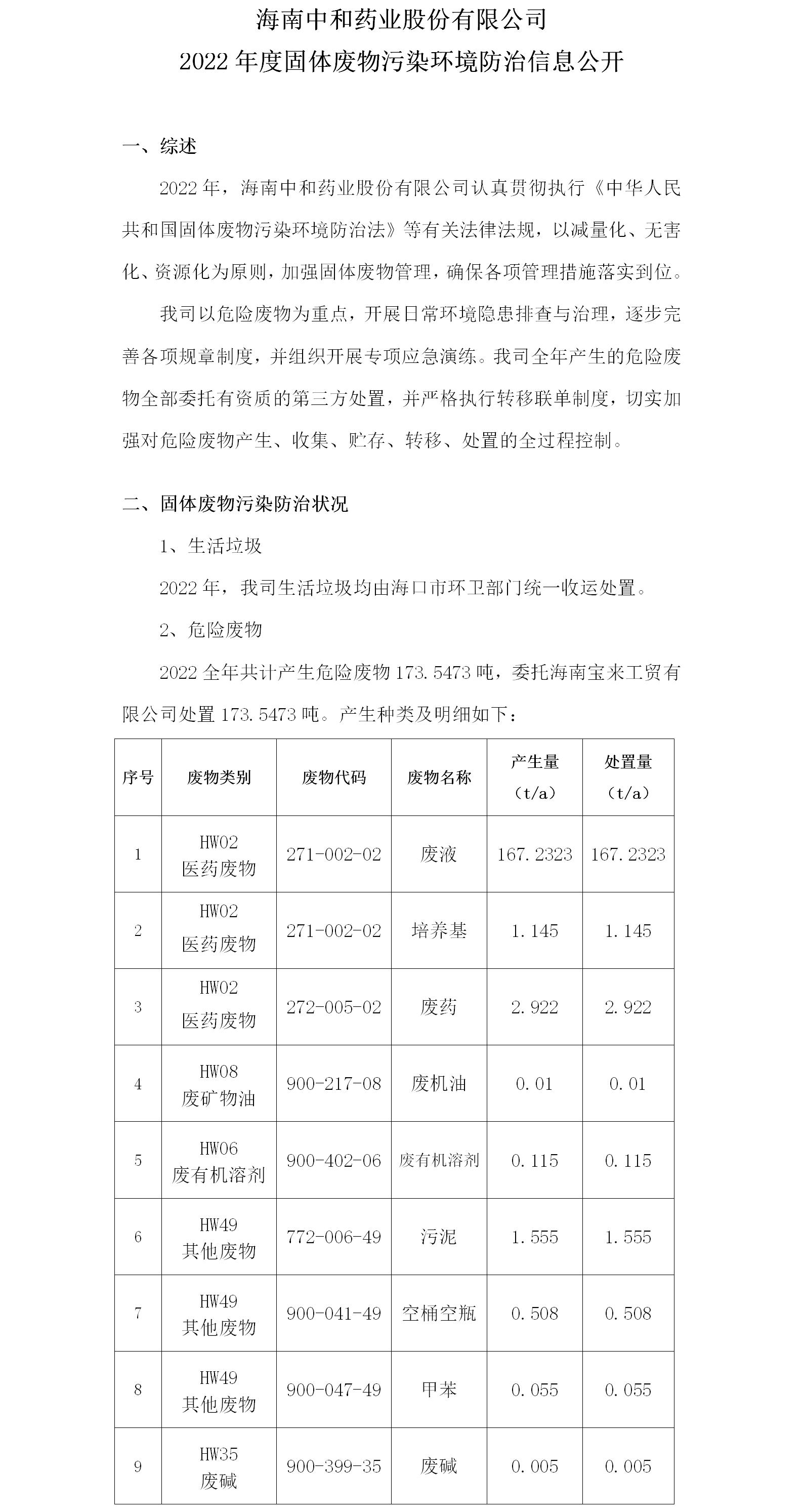 海南中和藥業(yè)股份有限公司2022年度固體廢物污染環(huán)境防治信息公開