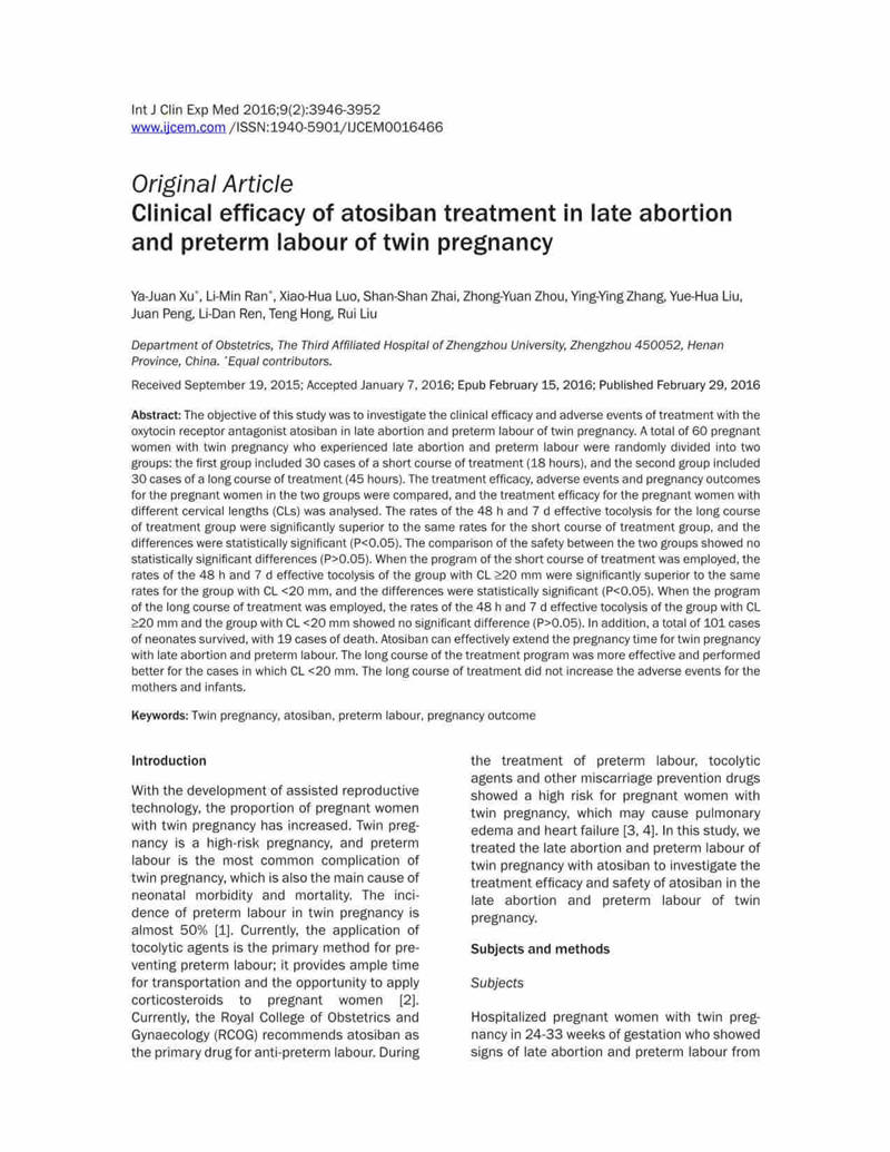 • 阿托西班治療雙胎妊娠晚期流產(chǎn)及早產(chǎn)的臨床療效