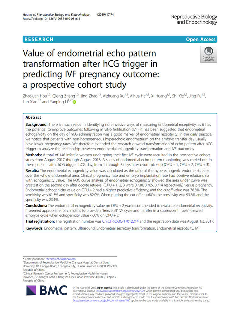 摘要 背景:非侵入性測量子宮內(nèi)膜容受性的方法很有價值,因為它有可能改善體外受精(IVF)結局。有人認為hCG給藥當天的子宮內(nèi)膜回...[詳細]